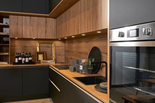 These days it’s hard to imagine kitchen design without the colour black. And why would you? This kitchen looks truly stunning thanks to the combination of black with a warm wooden hue such as volcanic oak in this design. And it offers plenty of storage space, too!
