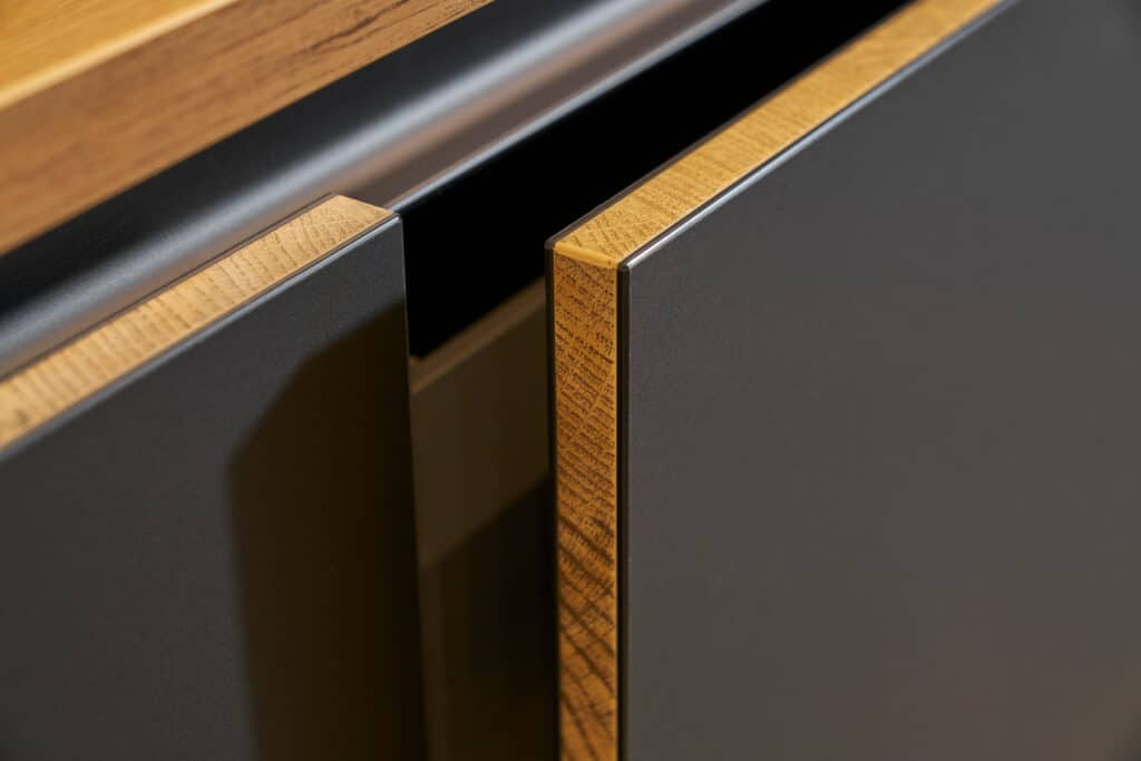 Even on their own, a front with anti-fingerprint technology and a volcanic oak edge show the high quality of this design. But choosing the handleless front with an illuminated finger pull provides the perfect stage for these details.